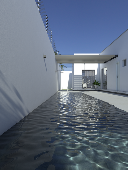 A casa possui uma leve elevação em relação ao terreno, criando a impressão de estar flutuando. Esse efeito é ainda mais impactante durante a noite, quando a iluminação da borda realça o contraste entre a estrutura e o solo. A modernidade também está presente na piscina, uma raia de borda infinita que se funde ao piso da área externa, criando a sensação de continuidade e sofisticação.