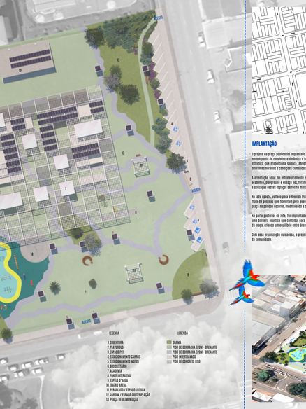 Em síntese, este projeto visa criar uma praça pública moderna, flexível e sustentável, integrando arquitetura, paisagismo e funcionalidade para atender a uma ampla gama de usos e necessidades. Com uma proposta que prioriza a acessibilidade, o conforto térmico, a integração com o ambiente natural e a sustentabilidade, a praça se configura como um espaço de convivência e aprendizado, sendo um ativo valioso para a comunidade e um exemplo de como a arquitetura pode transformar o espaço urbano de maneira responsável e inovadora.